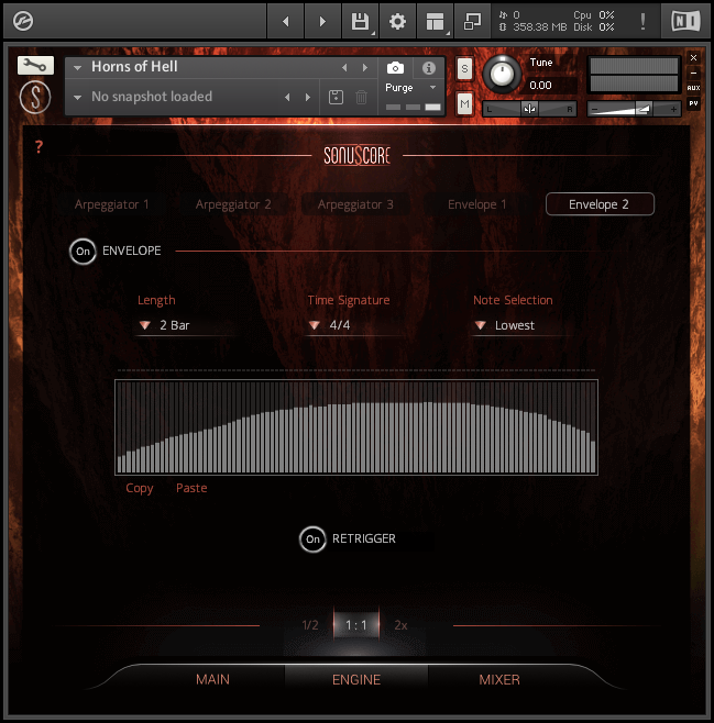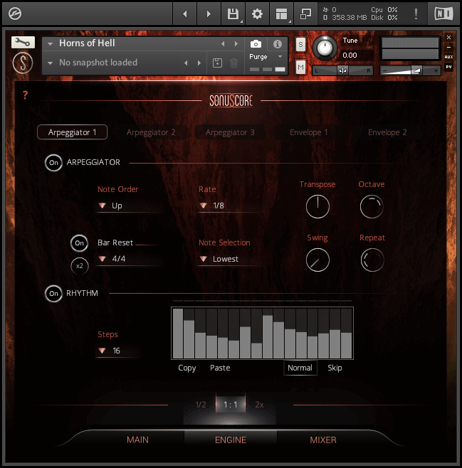 On the Engine page you can access all individual controls for each of the five instrument modules. Short notes can be arranged with the arpeggiators, while the brass vst’s sustained notes can be shaped with the velocity envelope. Create the orchestral colors as you need them and let the magic happen.