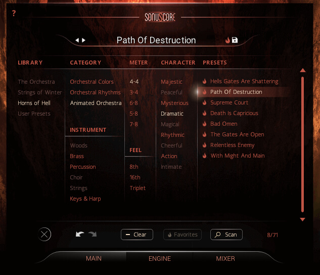 The HORNS OF HELL brass vst comes with a reworked engine version of our critically acclaimed instrument THE ORCHESTRA, introducing our brand-new preset browser. Explore the massive selection of brass vst presets now using intuitive filters and categories.